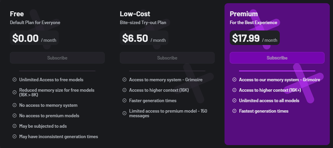 - Agnaistic — Free online interface with no registration needed. It runs on the Horde by default so there's no setup needed, but you can also use any of the AI services it accepts as long as you have the respective access key.